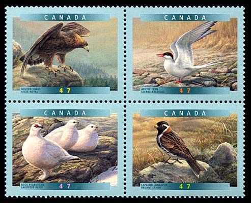 47c Birds: Lapland longspur, Arctic tern, Golden eagle, Rock Ptarmigan (block of 4) pic