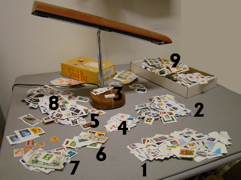 The UV light is a 'black tube' that fits into a goose-neck fluorescent-type lamp. This keeps both of my hands free for sorting/checking stamps. This type of light works extremely well for Canadian stamps (long wave) but it does not detect US tagging (short wave). Important: keep your eyes protected; wear prescription eye glasses or some other form of suitable eye protection. Work in a window-less room where the light can be turned off and provide complete darkness. Here are the different piles highlighted in the above image: 1. stamps to be checked (a bag sits on the floor and I bring out a handful at a time). 2. discard pile; those stamps that have been checked and nothing important was found. These will be given to children in a school stamp club which they will use to learn how to soak. 3. tagging errors that are found are placed on the base of the lamp. 4. I separate out, and keep, all Lowe-Martin coil stamps (flowers, olympics, animals) ... there are too many important die cutting varieties on these to discard any (except for damaged stamps). Also, the 50c Flower has both an important "ski slope" die cut variety and a rare "turquoise green background" variety, Unitrade 2072aiii (which needs to be checked with a short-wave UV light later). 5. Canadian commemoratives are separated. 6. Canadian definitives are separated. 7. foreign stamps are separated (USA definitives/Christmas are 'discarded'). 8. any 1c Traditional Trade stamps are separated. Years ago I heard of a "green thumb" variety that was thought to be constant. I have yet to find one, but the hunt continues. (this listing was just removed from the Unitrade as it is thought to not be constant) 9. after checking a couple of handful of stamps, the separated piles (4-7) are then moved from the table into the box. Looks like I am going to need a bigger box! Actually, these stamps will be removed from here shortly and placed in other storage boxes and/or soaked and then looked at more closely. Here is what the table looks like in the dark with the UV light on: